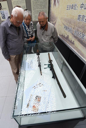 10月25日,林中斌(前右)、林中明在南京抗日航空烈士纪念馆展示他们捐赠的日军献降刀。当日,南京抗日航空烈士纪念馆获赠1945年日本投降时驻台湾日军将领献降的两把军刀,并在馆内公开展示。这两把献降刀是日本战国时期武士刀中的名刀,由当年中国战区台湾省受降工作及受降典礼参与者林文奎的儿子林中斌、林中明捐赠给南京抗日航空烈士纪念馆。抗战期间,林文奎曾担任美国援华航空队指挥官陈纳德的机要秘书及情报室主任。1945年9月16日,他带领第一批中国空军机群飞抵台湾,展开从日军手中接收的工作。1945年10月25日,中国战区台湾省受降典礼在台北举行,台湾光复。(新华社记者 孙参 摄)