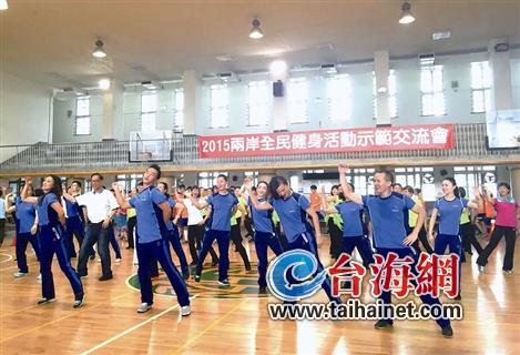 昨日,2015两岸全民健身活动示范交流会在台北弘道中学举行,两岸健身人才轮番上台表演拿手好戏。大陆代表们第一个展示的节目便是广场舞《活力绽放》,最后又以一曲激情四射的《小苹果》力邀“台湾大妈”上台共舞。被大陆坊间称为“广场舞男神”的《小苹果》编舞者王广成,站在队伍最中间领跳,全场气氛十分火爆。