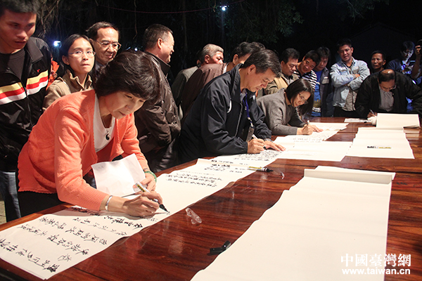 书院内无处不见的诗文碑帖和浓郁的文化氛围,也激起了大家的诗兴。当晚的两岸诗人联谊活动上,在婆娑树影,徐风晴空下,两岸诗人纷纷挥毫泼墨,书写诗情。
