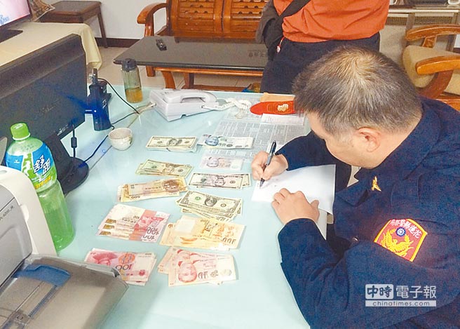 新城警方一一清点良心司机拾获的一袋外币,发现币值高达新台币17万元,并通报警广协寻失主。图片来源:台湾中时电子报