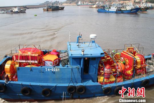 中新网福州2月16日电 (许琳晶)16日,春光明媚,福州连江黄岐码头热闹非凡。上午9点半台籍货轮“承顺号”缓缓驶来。今年第十四届“两马同春闹元宵”活动福州马尾区赠送的35组规格多样的花灯在这里运往马祖。