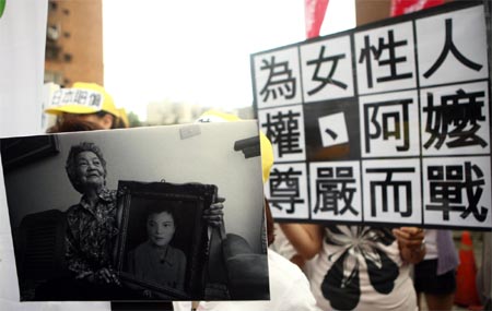 台籍“慰安妇”始终盼望日方道歉。图为2010年8月,台北民众举着标语和“慰安妇”照片抗议日本政府拒不道歉。新华社
