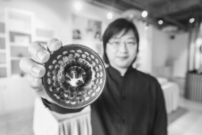 赵胜杰展示他专为平潭创作的茶盏,并命名为“黄金流瀑”。蔡起辉 王凤山 摄