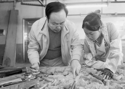 郑银聘(左)在传授徒弟雕刻技艺。 本报记者 刘深魁摄