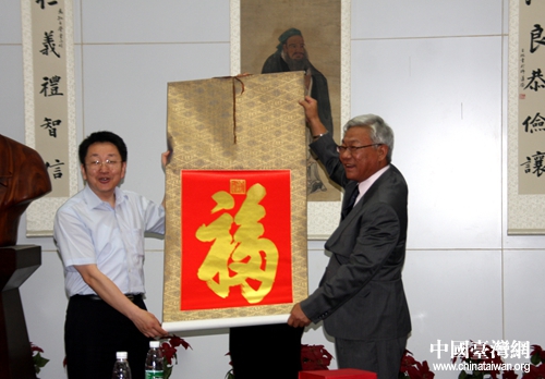 北京市西城区统战部部长程军(左)与参访团团长、台湾海军退役少将陈宝峰(右)交换礼物。(中国台湾网 李杰 摄)