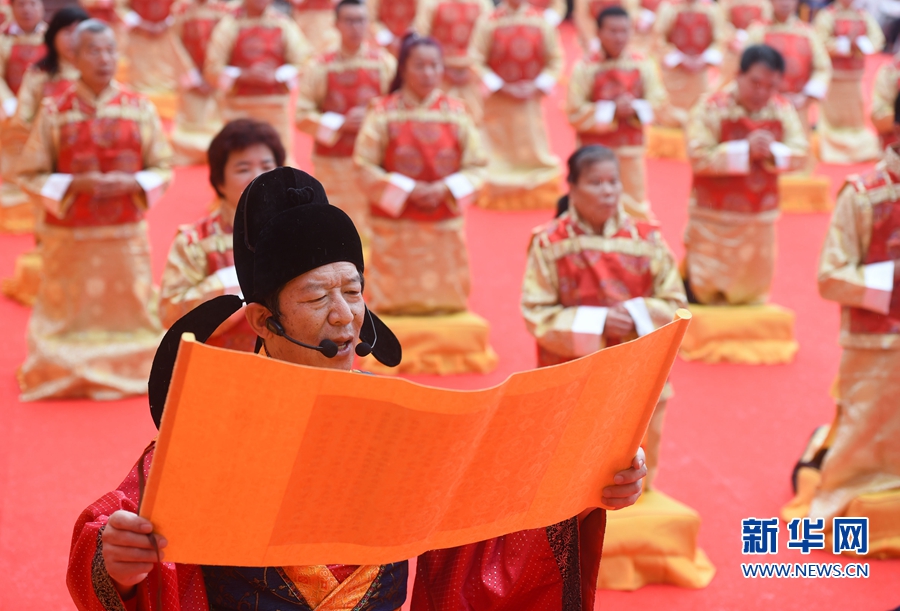 6月13日,司仪在临水夫人祭祀大典上敬诵祭文。