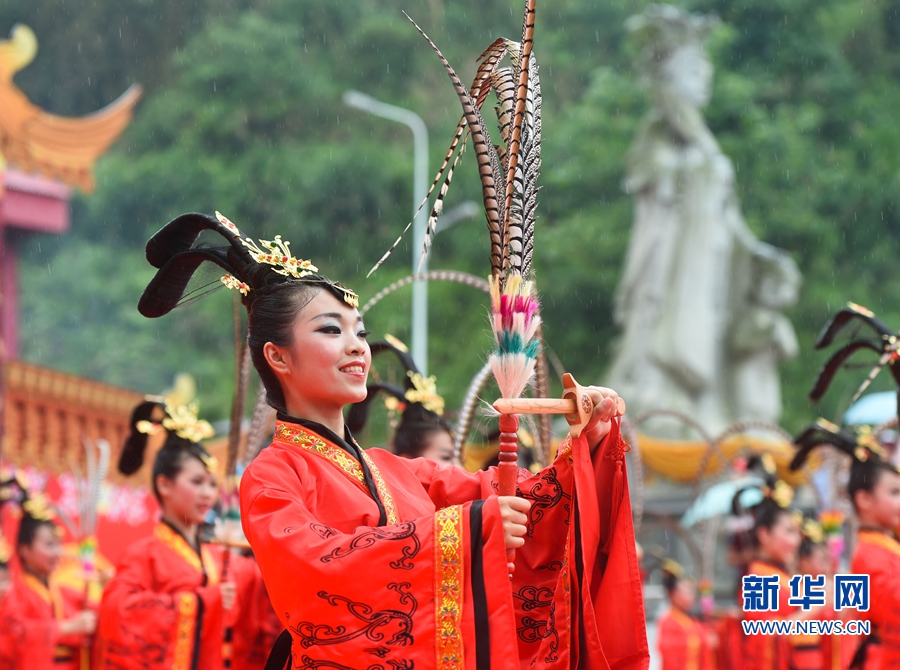 6月13日,身着传统服饰的女子在祭祀大典上进献乐舞。