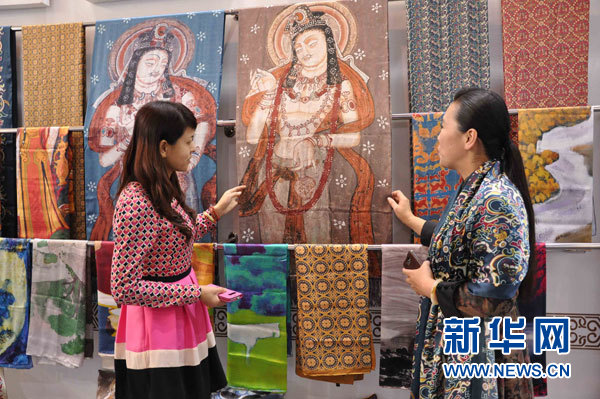 11月8日,在第八届北京文博会新疆展馆内,新疆八大画廊艺术总监施苏萍(右)在向参观者介绍真丝艺术披肩。