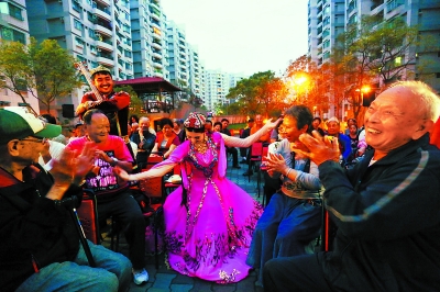 ▲ 台南市长荣里长荣社区是现在台南最大的眷村改造社区,这里的2000余户居民来自10个眷村,众多台湾大陆老兵居住在这里。为了迎接演出团,居民们提前三四个小时就聚集在社区的露天小舞台前。为了让这群特殊的观众了解新疆乐舞的魅力,古丽和同伴们走到观众席中间打起手鼓唱起歌,感染了众多老人。