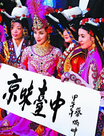 全体演员身着盛装亮相台中市政府大楼,展示台中市副市长蔡炳坤向交流团赠送的亲笔书法作品《京味台中》。