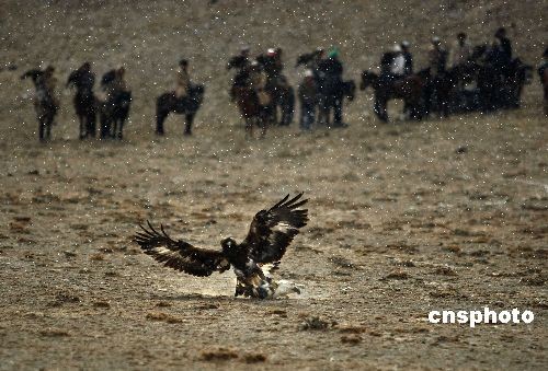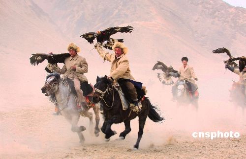 月21日上午,在“中国猎鹰故乡”新疆阿合奇县苏木塔什乡猎鹰场上,全县百余名猎鹰人带着猎鹰为参加“第二届猎鹰文化节”的游客展示“放飞猎鹰”、“猎鹰捕兔”、“猎鹰活捉狐狸”等民族特色节目。 中新社发 马卫平 摄