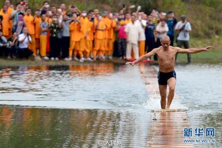 10月26日,福建泉州少林寺武僧释理亮在表演轻功“水上漂”。经过两次预热,他在媒体和观众的注视下,借助三合板用脚尖飞快地在水上成功“漂”出118米远,刷新了他自己100米的纪录。据悉,除“水上漂”外,释理亮还练就“飞墙走壁”和“一指禅”等绝技。