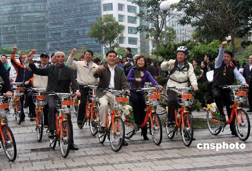 3月11日,为推动健康、环保与便民的公共政策,打造绿色城市,台北市启动“YouBike微笑单车”行动,希望以低污染、低耗能的公共自行车作为市民短程代步工具。图为台北市市长郝龙斌(前右四)在启动仪式后带头与参加者骑自行车出发,见证台北市公共自行车的诞生。中新社发 陈立宇 摄