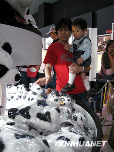 4月12日,一对母子在台北木栅动物园熊猫馆纪念品商店里选购熊猫玩具。