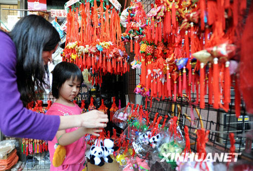 5月19日,一名小朋友在台北市街头选购端午香包。端午节临近,各式各样的香包在台北上市,熊猫造型的香包尤其受到孩子们喜爱。新华社发(吴景腾 摄)