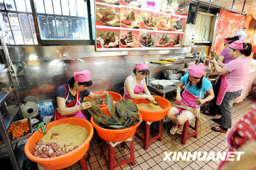 5月20日,台北市南门市场的商贩们在忙着包粽子。端午节临近,在台北市南门市场,广东口味的裹蒸粽、江浙口味的湖州粽、台湾口味的南粽和北粽纷纷上市。新华社发(吴景腾 摄)