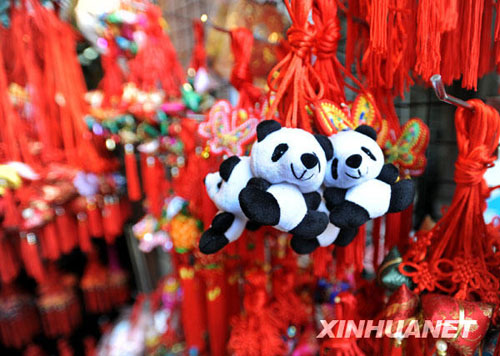 5月19日在台北市街头拍摄的熊猫造型的端午香包。端午节临近,各式各样的香包在台北上市,熊猫造型的香包尤其受到孩子们喜爱。新华社发(吴景腾 摄)