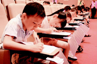 “海峡两岸状元杯心算暨数学公开邀请赛”12日在台湾桃园县举办,幼童快速心算,现场寂静无声。(图片来源:台湾《联合报》)