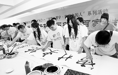 20日,在漳州青少年活动中心,前来参加第四届两岸青年联欢节的漳台两地100名青少年书法爱好者共同参加“海峡两岸炎黄子孙同写中华百家姓” 活动。两岸书法界的精英以书法艺术为媒,共同书写中华百家姓。(记者 祝敏松 摄)