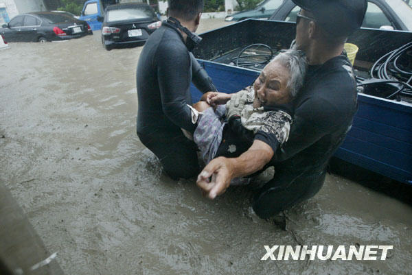 受台风“莫拉克”影响,台湾本岛目前的主要特点是“北部风强,南部雨大”。中南部地区的雨量惊人,以屏东县最为严重。到8日8时止,屏东山区近3天来的累计雨量已超过1400毫米。据了解,由于台风带来的大量降雨以及适逢大潮期,屏东所有沿海乡镇都遭遇到严重的水淹情形。新华社发(吴景腾摄)