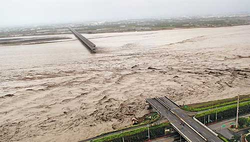 高屏溪暴涨的湍急溪水将双园大桥冲断,空中鸟瞰画面更显滚滚溪水声势惊人。
