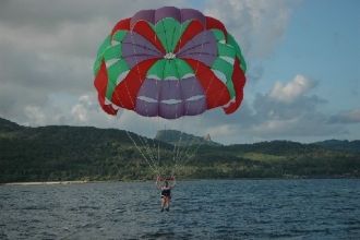 台湾民众喜爱旅行东南亚岛屿,这些海岛度假区大多拥有漂亮的沙滩,湛蓝的海水和迷人的艳阳蓝天,垦丁三者兼具,也是很适合亲水的海滨度假胜地。海外海岛常见的海上拖曵伞活动,在垦丁也有机会体验,而且是难度较高的海上船舶起降。游客随着拖曵伞缓缓升到空中,垦丁山海和聚落景观尽收眼底。