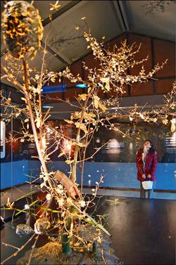 台湾著名金雕艺术家吴卿,在传艺中心举办“金色乡情”金雕展,展出物以黄金为主体,搭配其他材料创作而成,作品做工精细,金光闪闪,平时难得一见。