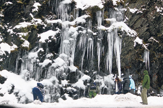 东南网1月6日讯 据台湾媒体报道,寒流接连来袭,合欢山积雪厚达二十公分,昨天山上虽未下雪,但北国风情美景吸引民众涌上山欣赏,一处山谷流水结成冰瀑,瀑柱晶莹,被称为“水晶宫”,是合欢山上最吸睛的雪景。