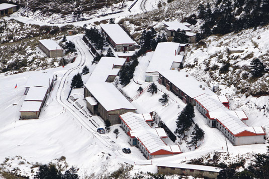 远处山庄的屋顶彷佛漆上白漆,路面成了滑雪场。