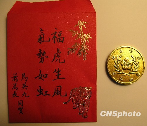 今年春节台湾放九天长假,台湾领导人马英九到全岛各地向民众祝贺春节并发放红包。马英九的红包内放有一枚金币巧克力,币面压制有“迎春纳福”、“吉祥如意”的字样及台湾领导人办公室的梅花徽记。 中新社发 耿军 摄