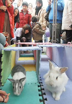 兔子奥林匹克运动会在台北华山创意园区举行,许多饲主带着兔宝贝参赛,兔子参加跑步、迷宫、顶球等赛事,主人可是比兔子还紧张。图片来源:联合报