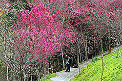 台中县东势林场森林花园正值樱花季,满山都是姹紫嫣红的山樱花及各式花海,相当明艳动人,是新春假期出外踏青,走春的好去处。