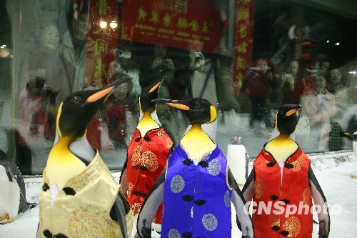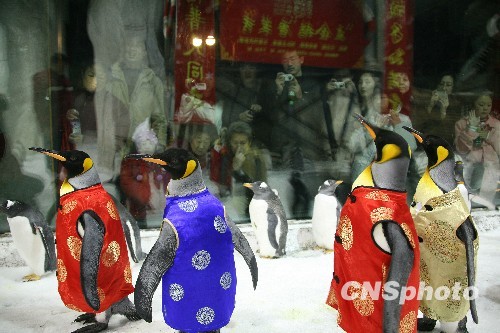 企鹅穿唐装闹新春。中新社发 陈浩浩 摄