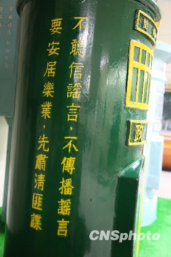 位于台北市重庆南路的邮政博物馆藏有许多记录着台湾邮政历史的文物。图为邮政博物馆收藏的、上世纪五十年代曾遍布台湾各地的邮筒,筒身上的标语记录了两岸关系的历史。在两岸实现了包括通邮在内的“三通”的今天,两岸人民更加珍惜来之不易的和平发展的两岸关系。中新社发 耿军 摄