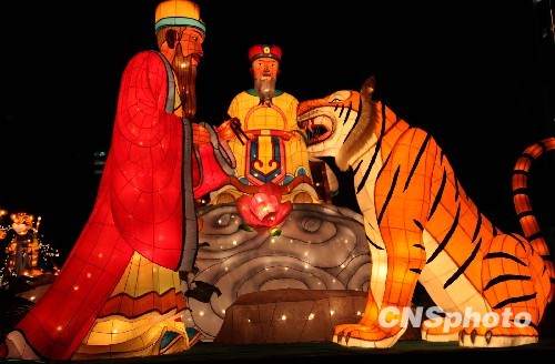 图为根据中国古代传说制作的花灯“保生大帝医虎喉”。中新社发 耿军 摄