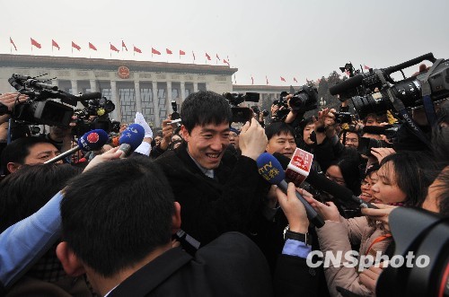 3月3日下午,政协委员刘翔在北京人民大会堂外突破重围,去出席全国政协十一届三次会议开幕式。