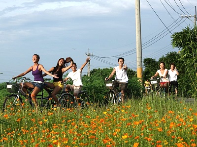 和三五好友一同骑车赏花是春季出游的一大乐趣。(图/金山原宿提供) 谢燕豪