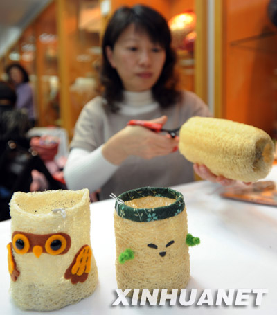 3月8日,来自嘉义县农村家政班的女手工艺者在现场示范丝瓜络制品的制作方法。