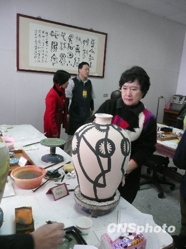图为台湾著名女画家李重重在陶瓷上作画。中新社发 闫晓虹 摄