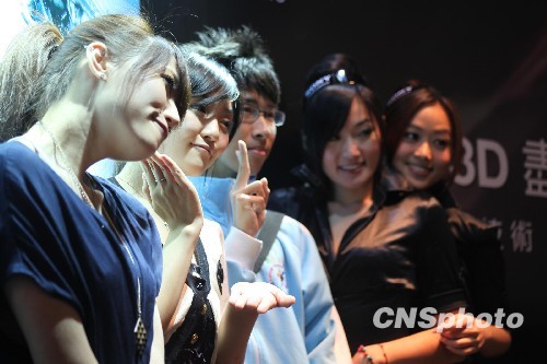 4月8日,一家品牌电子厂商在台北春季电脑展上以美女吸引参观者合影,聚集人气。当天,2010台北春季电脑展开幕,各品牌厂商竞打“美女秀”推介产品。中新社发 罗钦文 摄