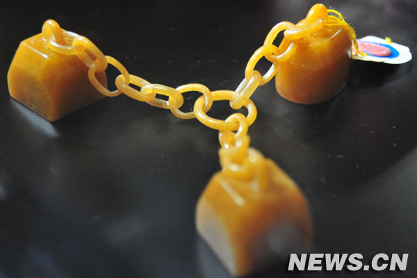三连扣田黄印壹组三枚。新华社驻台记者 徐 然 摄