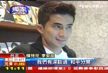据台湾TVBS电视台报道,最近有一个模特儿界的新人格外引人注意,因为他曾经是当红歌手萧亚轩的前男友,他的名字叫李安祖,长的高大帅气是巴西和日本的混血儿,前女友的名气比他大上许多,但这几年来台湾发展,虽然曾穷到连续2个月只吃面包度日,李安祖在台湾日子过的很辛苦,但在巴西却是家产雄厚,母亲拥有40英亩大的农场,算是巴西农场小开。今天接受TVBS独家访问,他也认了跟萧亚轩的往日恋情。