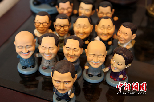 随着大陆民众赴台旅游人数激增,台湾业者推出两岸领导人公仔,大受欢迎。图为台北一位人士收藏的孙中山、毛泽东、蒋介石、邓小平、蒋经国、马英九、萧万长等个性公仔,个个造型讲究,笑容可掬。中新社发 董会峰 摄