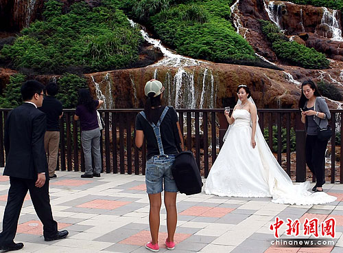 台北县九份一处自然风光旅游景点上,6月23日一对新人在拍摄婚纱照。据悉,该县有居台湾之最的野柳女王头、淡水渔人码头、皇冠海岸等自然风光旅游景点,目前当地旅游部门正在尽力为游客提高旅游质量做工作。中新社记者 宋吉河 摄