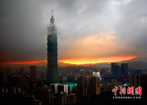 6月28日傍晚,台北市一阵大雨后,从象山俯瞰市区,101摩天大楼耸入云霄,后山红云如火,景观如画。美丽的台北市地处盆地,气候多变,夏季的城市景色也时常变幻莫测。中新社记者 宋吉河摄