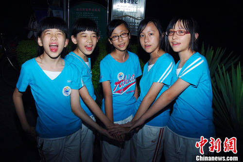 7月6日,大陆双胞胎绿豆和青豆(左边二个)将台湾三胞胎何佩瑄、何佩瑜、何佩玮(右边三个)接到家中。“2010.阳光海峡——两岸快乐小天使活动营”两岸小朋友结对交友,大陆小朋友的家长们来接台湾小朋友民宿。张丽君 摄