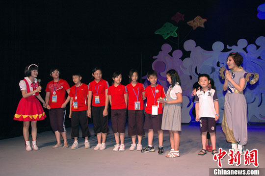 7月7日晚,来自台湾的小朋友还收到了一份“棒棒TV”送出的特别礼物。参加“2010·阳光海峡——两岸快乐小天使活动营”的小营员们在福建人民艺术剧院观看由福建当地节目“棒棒TV”全体主持人首次献演的儿童剧《我和我的影子》。曾伟 摄