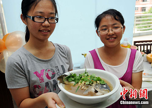 7月14日下午,参加“2010年海峡两岸青年联欢节·中医药传统文化研习营” 药膳大赛的福建中医药大学学生陈晓芳(右)与台湾慈济大学学生黄韵芹(左)齐心完成药膳菜“当归炖鲫鱼”。由福建中医药大学、共青团福建省委、福建省台湾同胞联谊会联合主办的研习营为期两周,开设有中医药文化、针灸学、养生药膳、太极拳等课程。来自台湾慈济大学和台湾嘉南药理科技大学的32名学生及福建中医药大学的部分学生代表参加此次的研习营活动。中新社发 刘可耕 摄