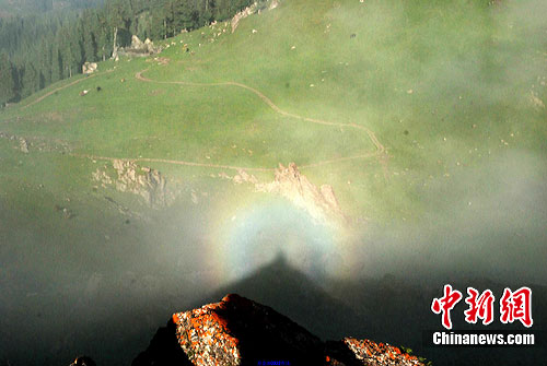 7月24日19时许,新疆天山天池云开雨霁,落日余晖下天池灯杆山上空突然出现一道美丽的彩虹,看上去如同传说中的佛光,令人赞叹不已。中新社发 陶拴科 刘英 摄