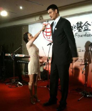 侯佩岑为姚明主持募款晚会,现场采访过程中因为身高差距太大,让侯佩岑吃足了苦头,但她还把这逗趣的照片放在部落格(博客)上分享,照片中的侯佩岑穿上高跟鞋,手伸的很长才访问得到姚明,虽然头一直要后仰90度才看的到姚明的脸,不过侯佩岑这身曲线也挺美的!
